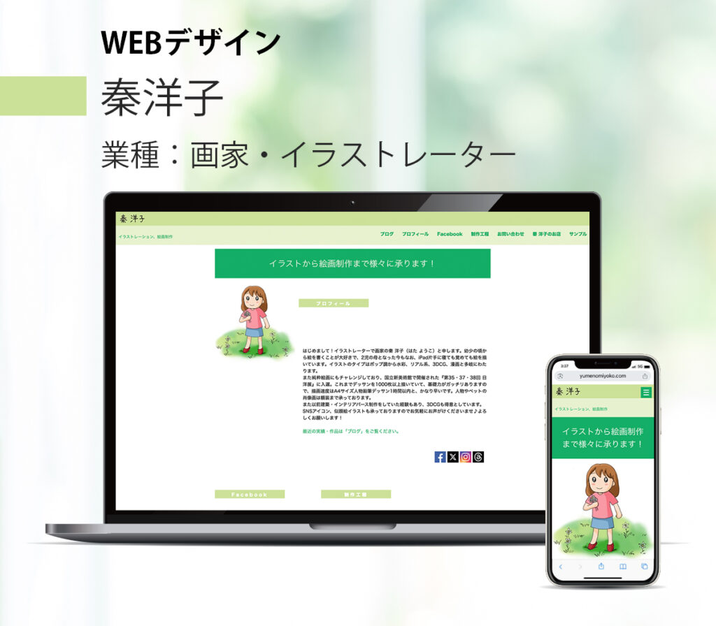 画家・イラストレーターでもある秦洋子のホームページを作成いたしました。トップページはシンプルな1枚ものとなっております。 作品を際立たせるために、余白が多めのデザインとなっています。 https://www.yumenomiyoko.com